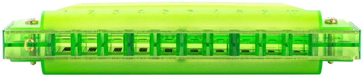 Губная гармошка в зеленом полупрозрачном корпусе с язычками из высококачественной латуни.