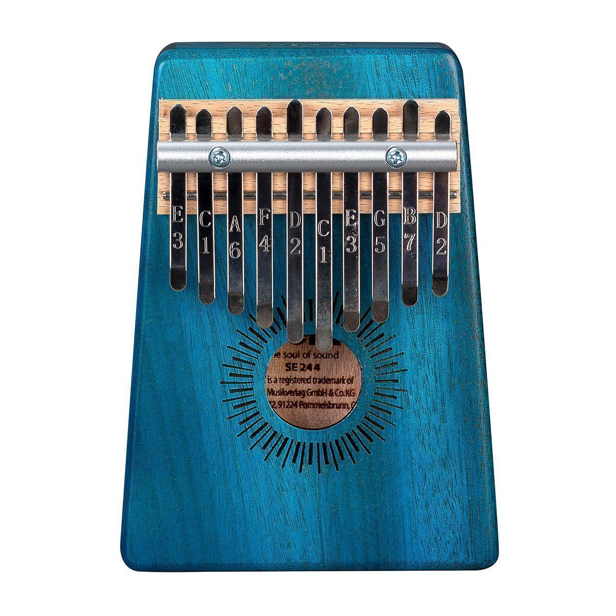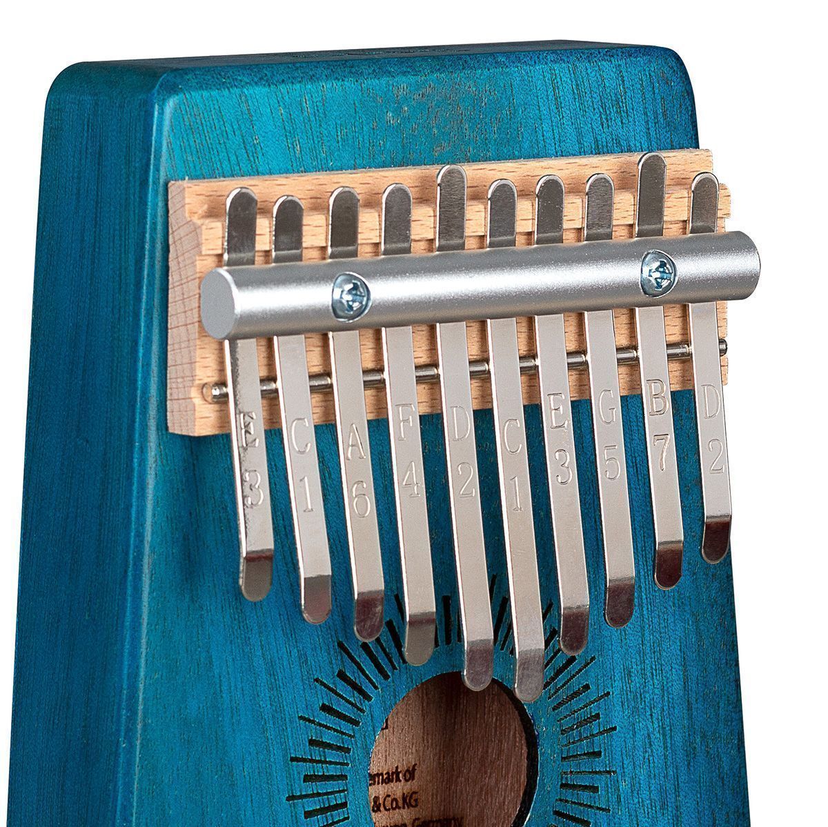 Калимба изготовлена из высококачественного красного дерева. Корпус усиливает низкие частоты и, таким образом, производит полный, чистый и теплый звук с завораживающим резонансом. Высококачественные металлические язычки настроены в до мажоре и имеют диапазон от c' - e'' (C4 - E5). Обозначение нот на язычках делают калимбу подходящей как для начинающих, так и для опытных музыкантов.